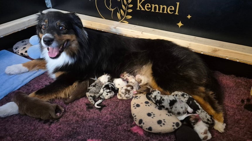 Toen Petra, mijn lieve vriendin en collega fokker, alvast mijn kant op kwam die zondagavond. Kon ze het niet beter timen. Net voordat ze er was begon Flake persweeën te krijgen. Het eerste vruchtje kwam in zicht en een blue merle teefje Maia werd als eerste geboren. Wat een leven zat er meteen in dat meisje! Heerlijk. Daarna bleef het meteen vrij rustig en hebben we weer een uurtje gewacht totdat ze weer begon te persen. Als de eerste er eenmaal uit is, hoeft Flake nooit lang te persen. Dan vliegen ze er bijna uit. Dus op wat flinke pauzes tussen de pups na, soms zelfs even slapen voor Flake, waren de pups zo geboren. Zoals verwacht zitten er wel wat verschillen in grootte. De ene pup heeft toch meer ruimte in de buik van de moeder dan de ander en daarnaast was het een flink volle buik met 9 pups!
